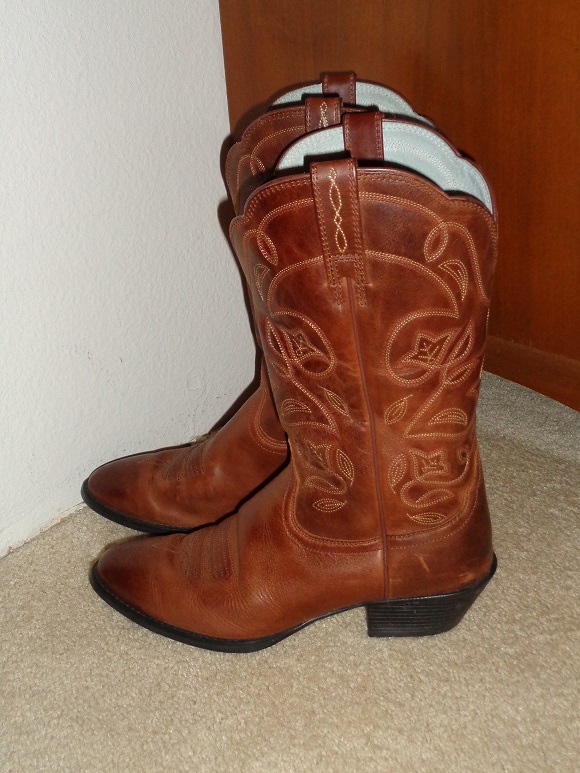 Ever since I bought myself a pair of cowboy boots for my birthday last fall, I have had that Toby Keith song, Should’ve Been A Cowboy, in my head. Daddy did always say that he wanted to teach us to “Ride hard, shoot straight, and speak the truth.” [Later we added “drive stick shift” to the list.] The “ride hard” part was always figurative. In recent years, though, I have become interested in learning to ride. This has led to a plan to go to a dude ranch. One of the first things I discovered was that, in order to ride, you need proper boots. And so it was that I purchased myself a pair of genuine Western style cowboy boots.